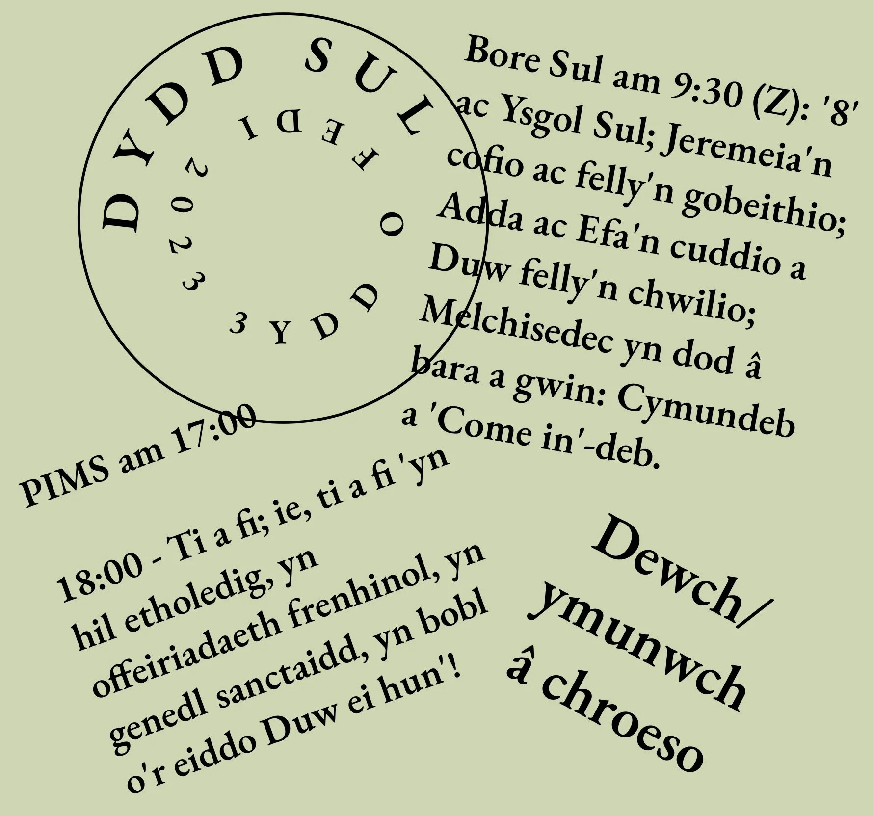 Yfory, pawb ynghyd yng Nghapel y Crwys (Heol Richmond) 10:30 y bore a 6 yr hwyr: Y Parchedig Dafydd Andrew Jones. Boed bendith.